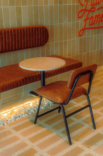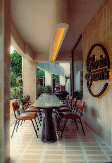 Extending the experience beyond the main interior, the café features a street-facing verandah at the entrance. This outdoor space continues the same Perlino stone flooring, offering high-top bar seating with views to the street. Paired with terracotta-toned chairs and potted plants, this area creates an inviting transition between indoor and outdoor zones, perfect for casual seating or quick coffee breaks.