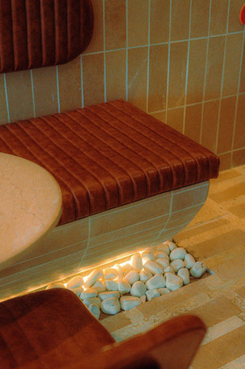 On the upper level, the first-floor terrace introduces a more playful and relaxed ambiance. It features stepped seating integrated directly into the architecture, also clad in Perlino stone to maintain material continuity. Round tables are mounted to the walls, complemented by plush circular cushions in deep green and rust orange tones. This space offers a semi-private, elevated retreat for guests looking to linger in comfort while enjoying views of the surrounding greenery.